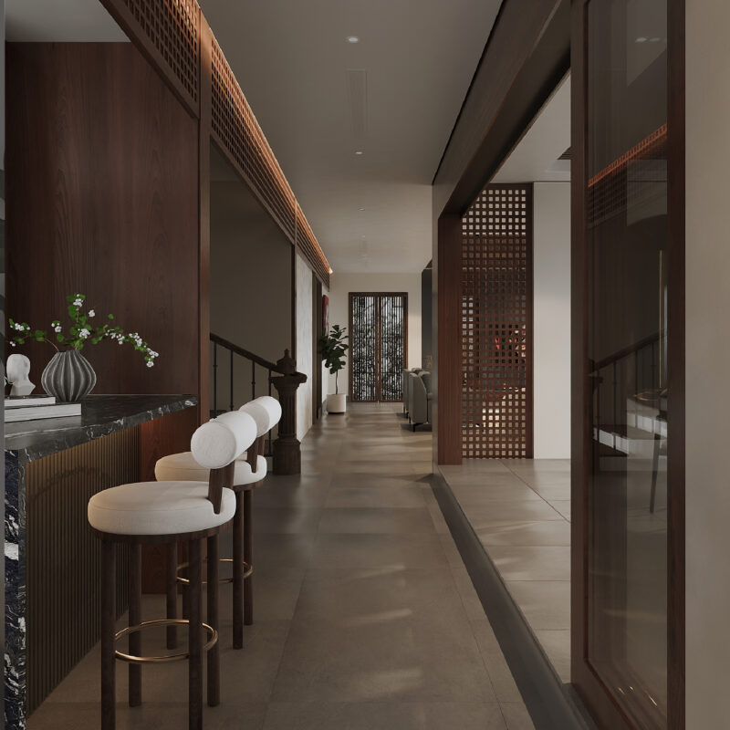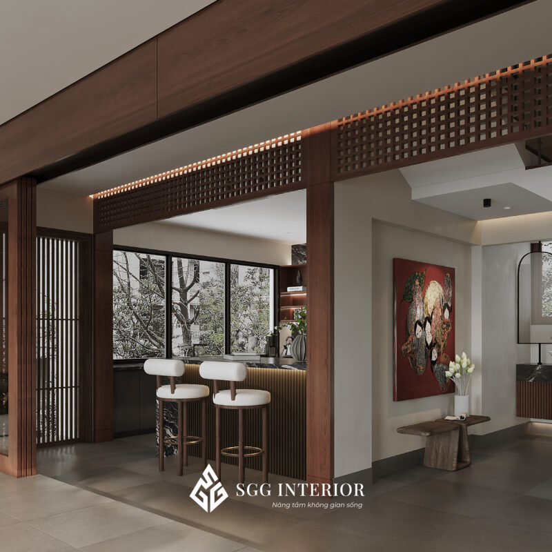 vách ngăn gợi nhắc về nét kiến trúc truyền thống nhưng được thổi hồn hiện đại.