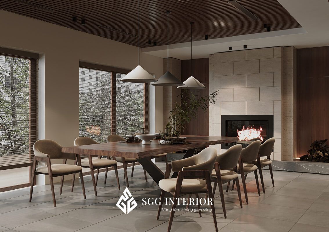 Tận dụng lợi thế vị trí, các kiến trúc sư của SGG Interior đã ưu tiên giải pháp không gian mở. Hệ cửa kính kịch trần được bố trí khéo léo giúp xóa nhòa ranh giới giữa nội thất và ngoại thất. Gia chủ có thể tận hưởng ánh sáng tự nhiên và tầm nhìn ôm trọn cảnh sắc núi rừng ngay khi đang ngồi tại phòng khách.