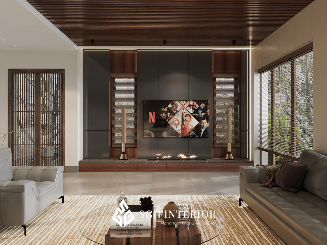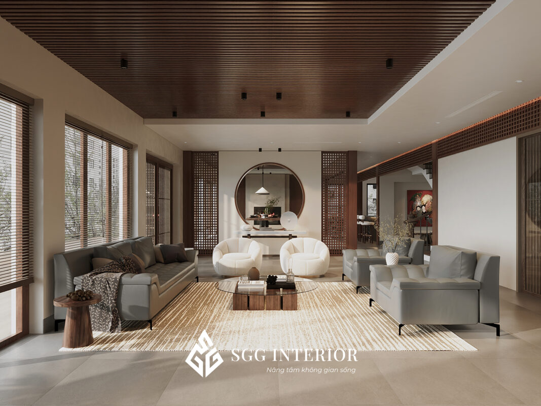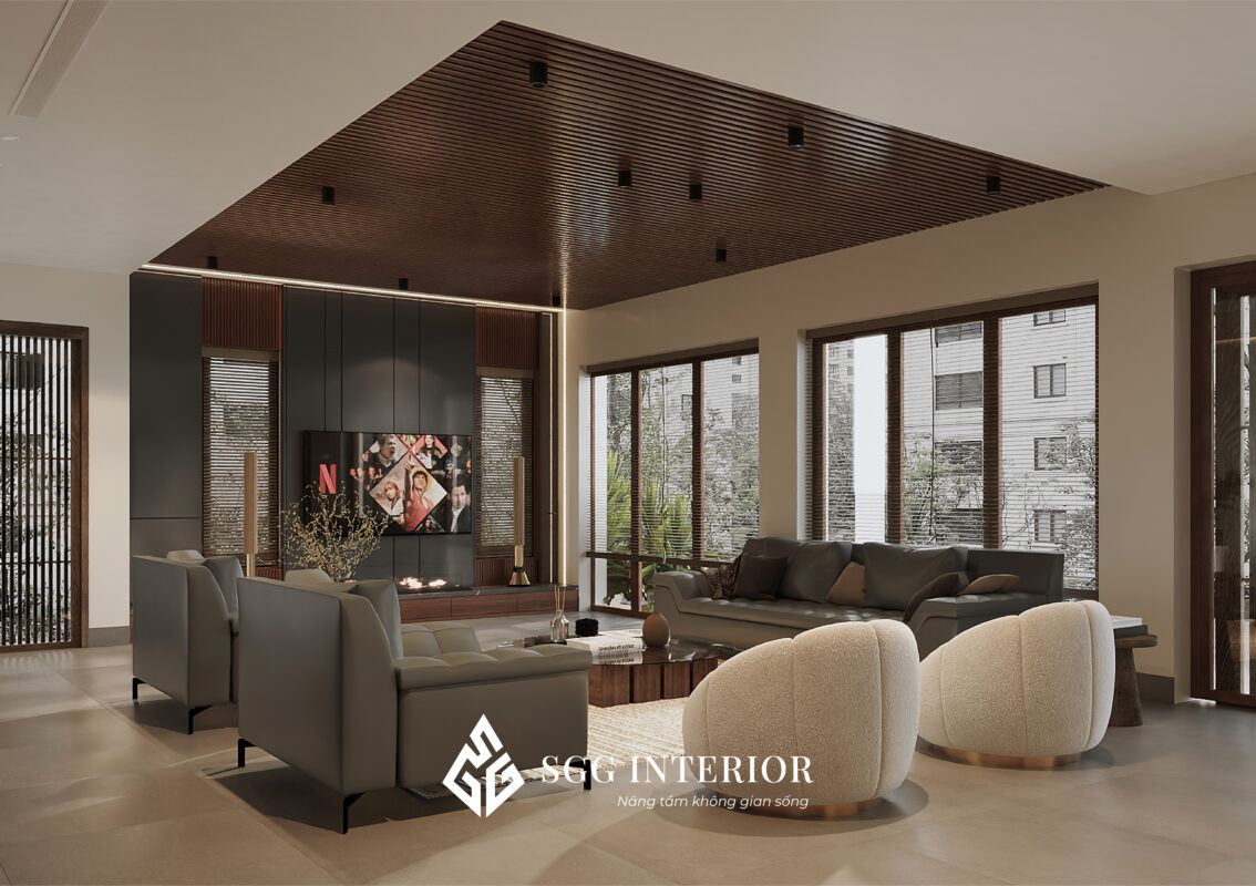 Khu vực sinh hoạt chung gây ấn tượng mạnh với hệ trần nan gỗ tối màu, tạo cảm giác bề thế và ấm cúng.