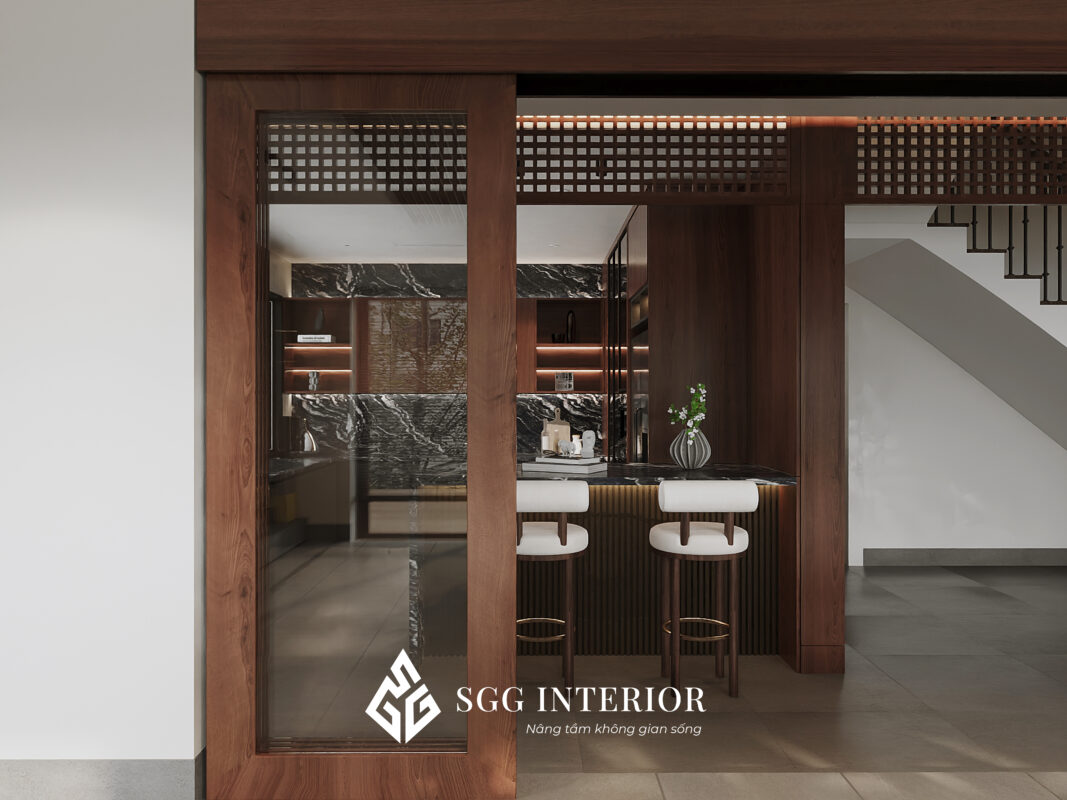 Ngay cạnh đó là quầy bar mini hiện đại với mặt đá đen huyền bí, nơi gia chủ có thể thư giãn với những ly vang sau một ngày dài.