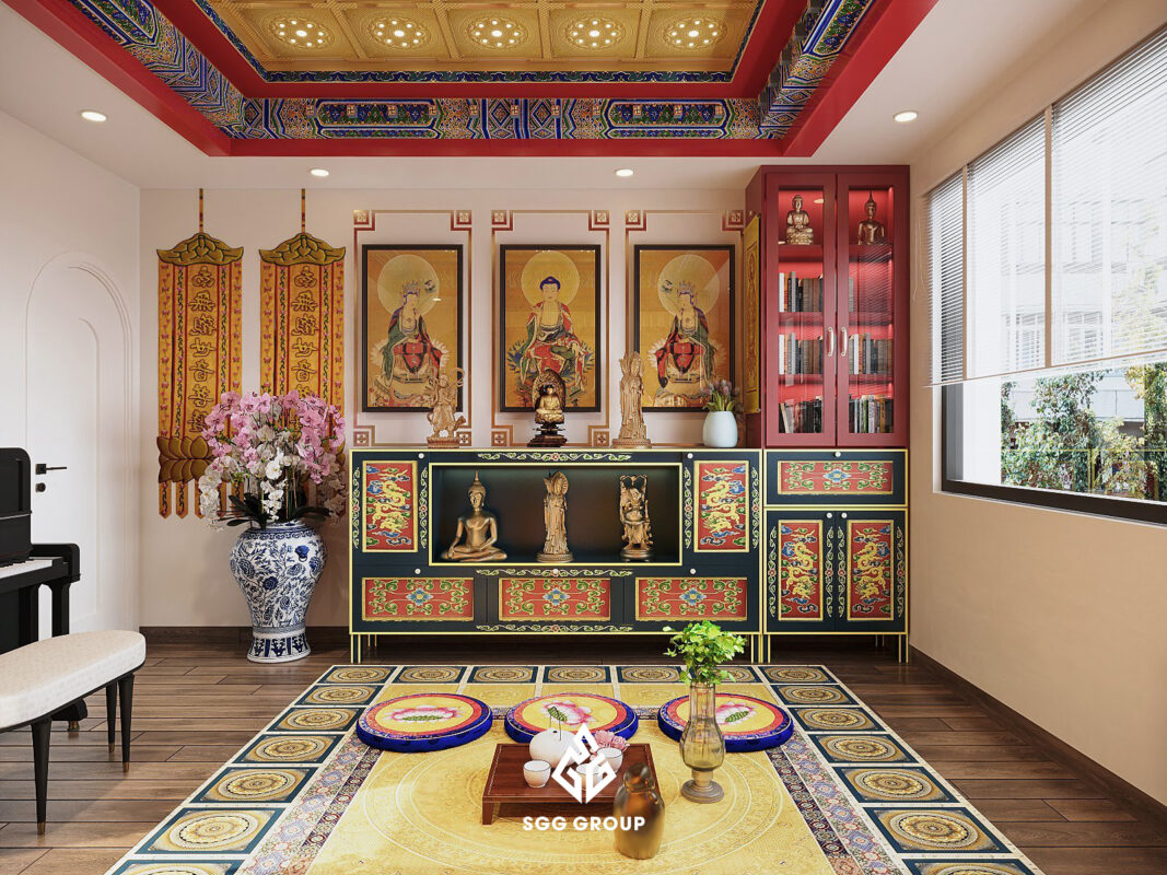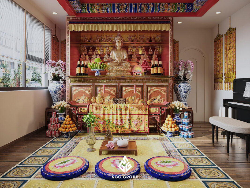 Là người theo đạo Phật, gia chủ mong muốn một không gian thờ tự trang nghiêm, giữ được những nét đặc trưng trong của tĩn ngưỡng phật giáo Nam Tông nhưng cũng không xa rời không gian ở của chính mình.