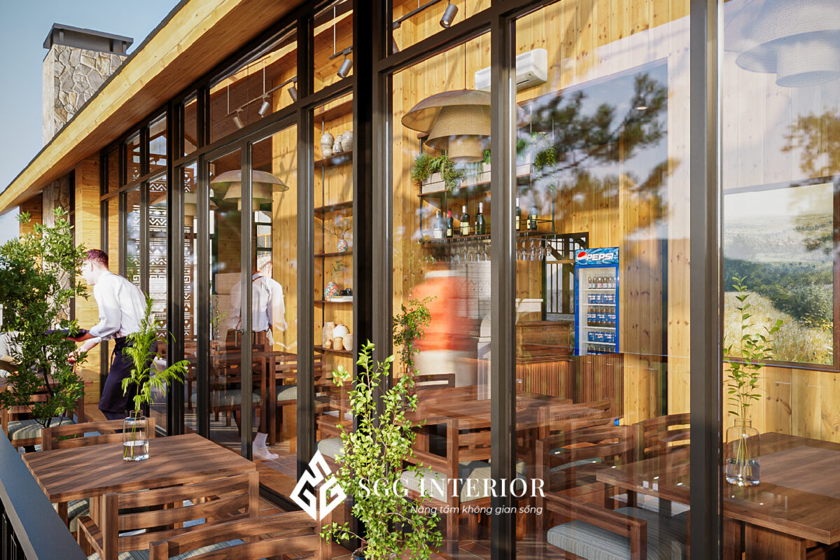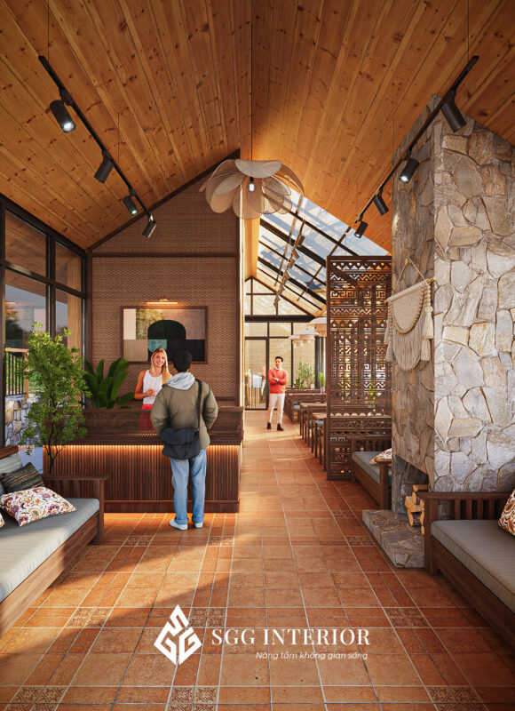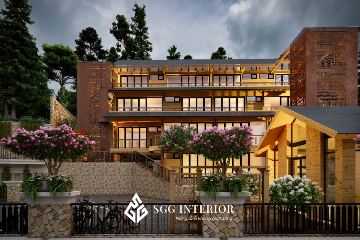 Toàn bộ dự án được bao bọc bởi sắc xanh của núi rừng. SGG ưu tiên sử dụng các vật liệu bản địa như đá hộc, gỗ tự nhiên kết hợp cùng hệ khung thép và kính cường lực. Sự đồng bộ trong màu sắc – từ sắc nâu trầm của gỗ đến tông xám lạnh của đá tạo nên một diện mạo bề thế nhưng vẫn vô cùng gần gũi.