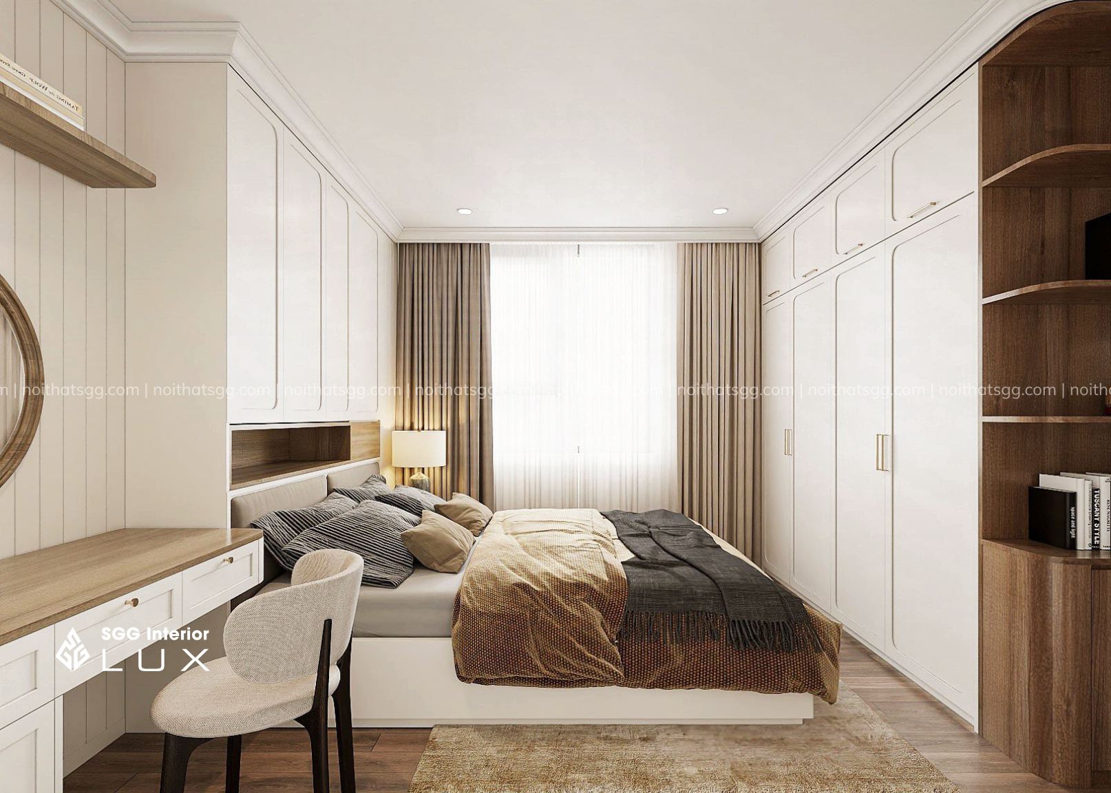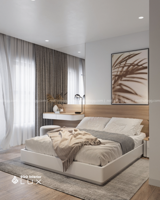 Phòng ngủ nhẹ nhàng với gam màu be – nâu ấm, mang lại cảm giác thư giãn và bình yên trong từng khoảnh khắc.
