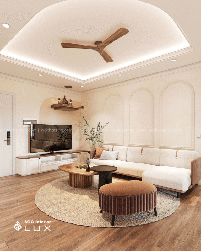 Với SGG Interior, không gian không chỉ đơn giản là sự phối hợp giữa các món đồ nội thất. Mỗi chi tiết đều được lựa chọn tỉ mỉ, hài hòa, mang đến một không gian sống vừa hiện đại, vừa ấm cúng, vừa dễ chịu. Bộ sofa vải thô màu beige không chỉ là nơi để nghỉ ngơi mà còn là lời mời gọi sự thư giãn, cho phép chủ nhân của căn nhà thả lỏng cơ thể và tâm hồn sau một ngày dài. Những chiếc gối da nâu đặt nhẹ nhàng trên sofa là điểm nhấn ấm áp, tạo nên sự cá tính mà không làm mất đi vẻ thanh thoát của không gian.